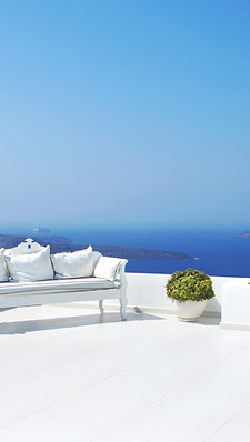 beautiful beach with clean waters, many coffee shops and taverns in a small harbor.